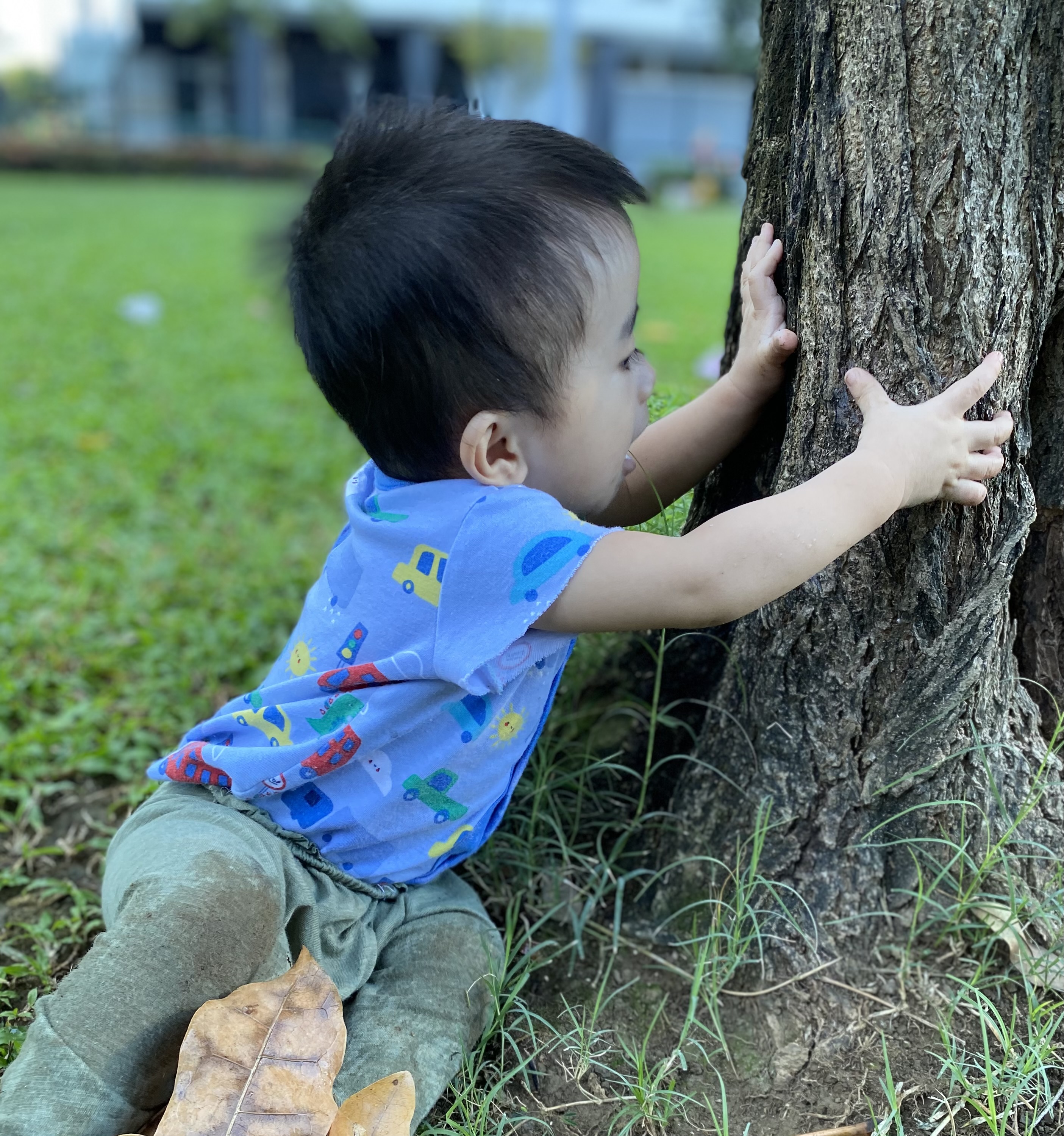 In a small tranquil park nestled within a bustling city, this young explorer, with an endearing tuft of hair that danced with the breeze, had embarked on a grand adventure in the great outdoors.