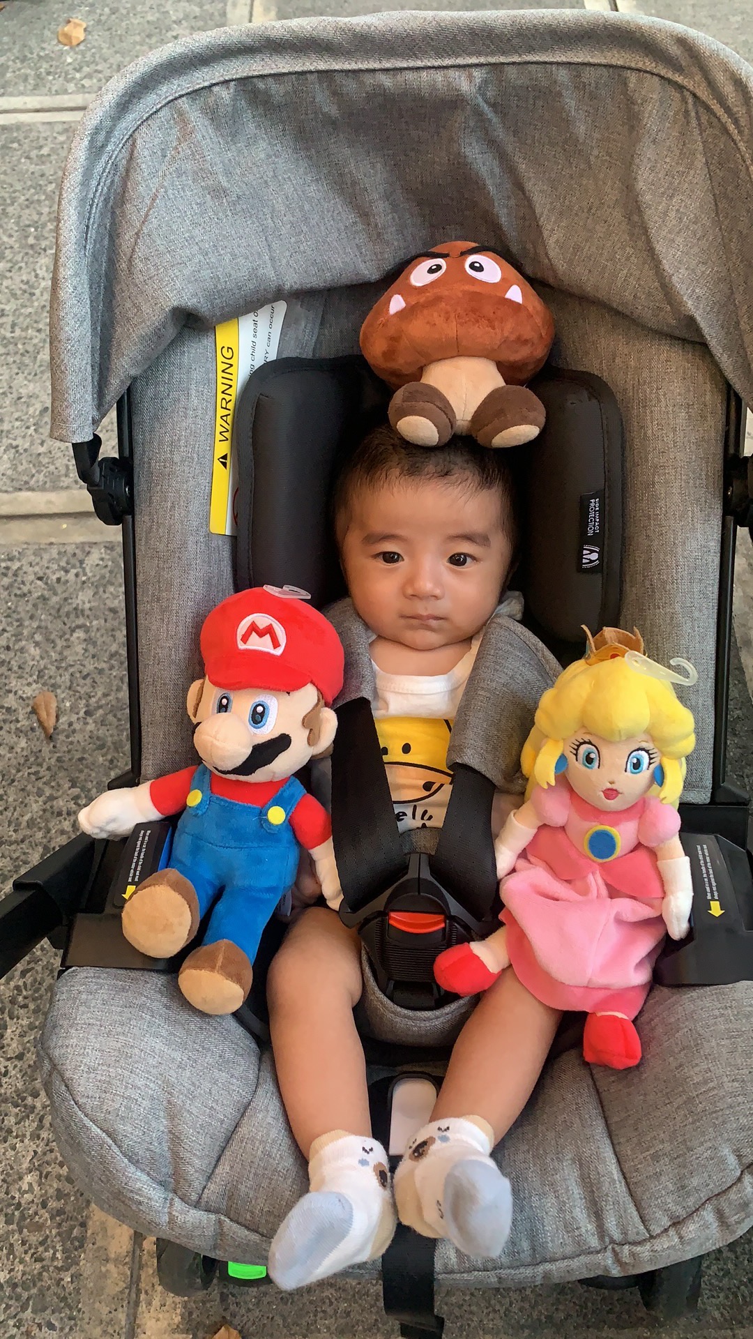 In this heartwarming scene, Dorensoy is snugly secured in a stroller, flanked by plush toys of Mario and Princess Peach which his papa bought from Japan, these friends beloved from the world of Nintendo. Dorensoy’s curious and calm gaze meets the camera, surrounded by comfort and color, evoking a sense of childhood innocence and play.